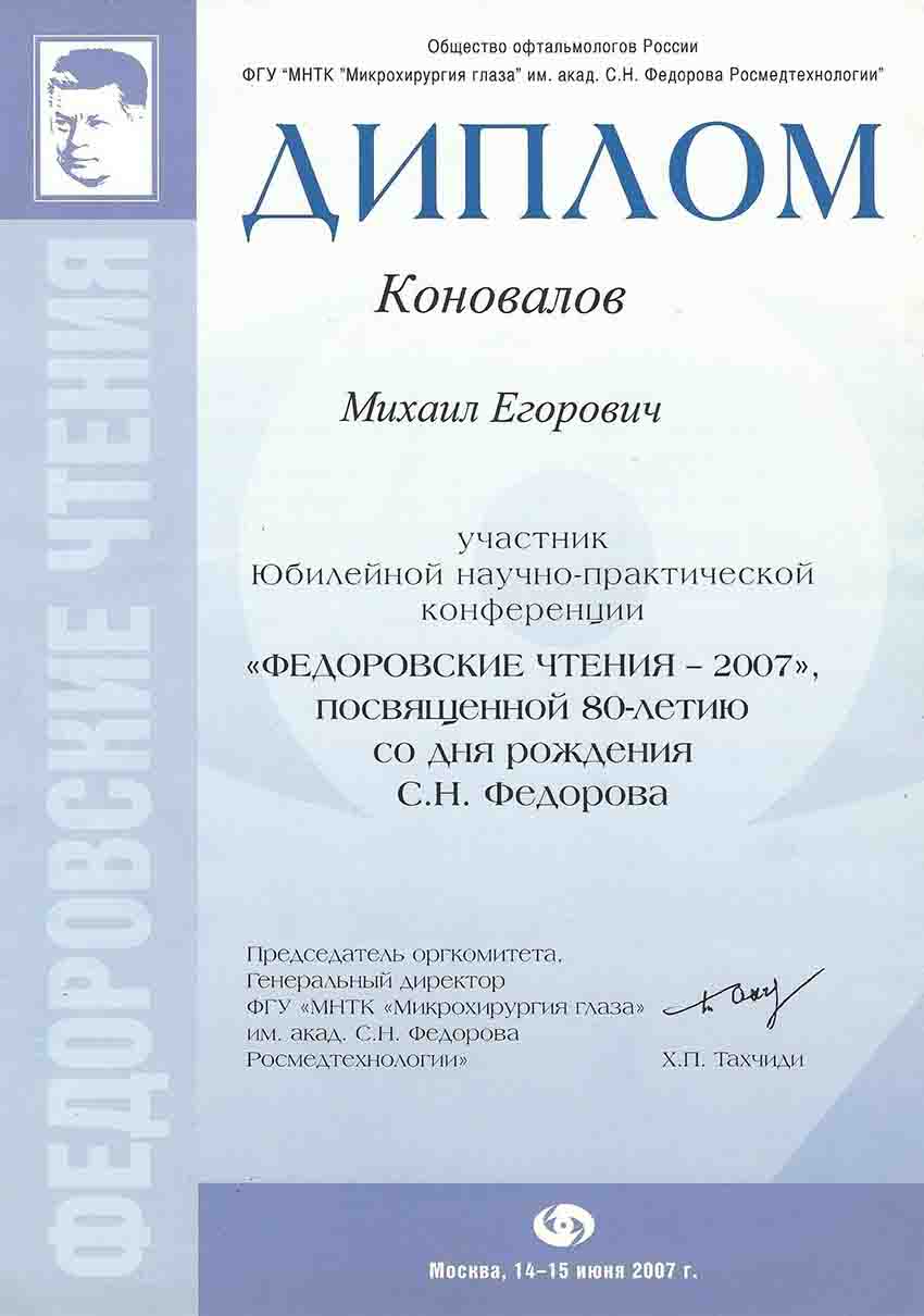 В 1997 году Михаилу Егоровичу предложили возглавить Центр офтальмокоррекции Медцентра Управления делами Президента РФ в Москве, где он работал вплоть до 2001 года. А уже в 1999 году в Алматы была создана собственная офтальмологическая клиника - «Лазерный центр Коновалова». Практически сразу Михаил Егорович начал искать возможность открытия центра в Москве. Пришлось искать помещение, проходить всяческие согласования, делать ремонт, получать лицензию. И уже в октябре 2001 года открылся «Офтальмологический центр Коновалова» в Москве.
