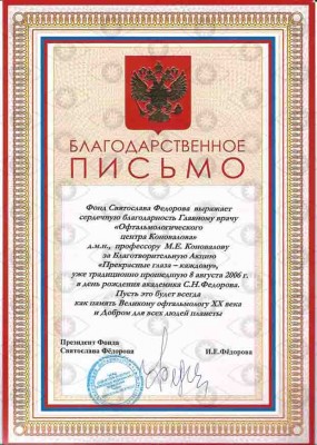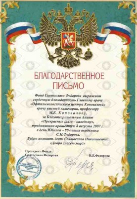 Большую роль сыграло то, что на момент открытия Михаил Егорович имел успешный опыт продвижения офтальмологических центров в Италии и Казахстане и хорошо знал этот бизнес - какой должна быть частная клиника, каким там должен быть уровень услуг, даже то, как надо встречать и провожать пациента. Таким образом, в центрах профессора Коновалова реализован весь опыт, который был накоплен им за годы работы в разных местах, собрав все самое лучшее, что по отдельности было свойственно и институту Федорова, и элитной европейской клинике, и традициям кремлевской медицины.